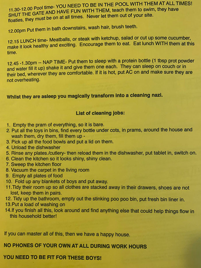 Post the children’s bedtime, the nanny was slated to undertake the comprehensive cleaning of the family’s entire home. An arrangement that raises an eyebrow, to say the least.