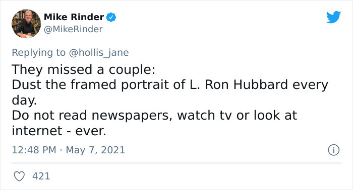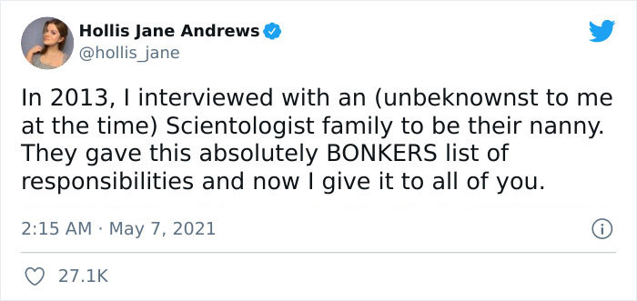 In 2013, Hollis interviewed for a nanny position within a Scientologist family.