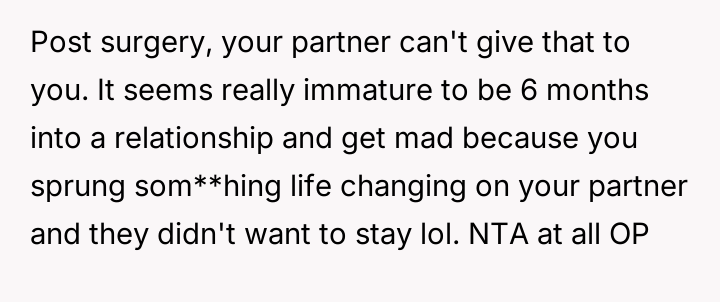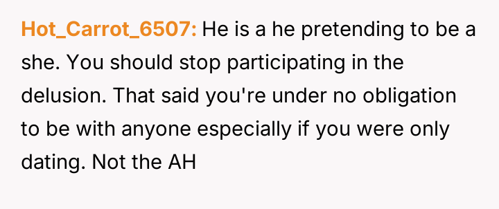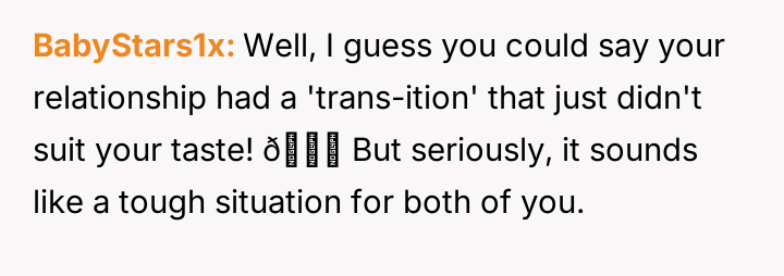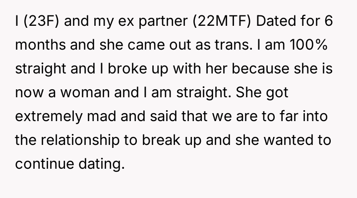 The story involves a 23-year-old woman (OP) who ended a six-month relationship with her partner (22MTF) shortly after the partner came out as transgender.
