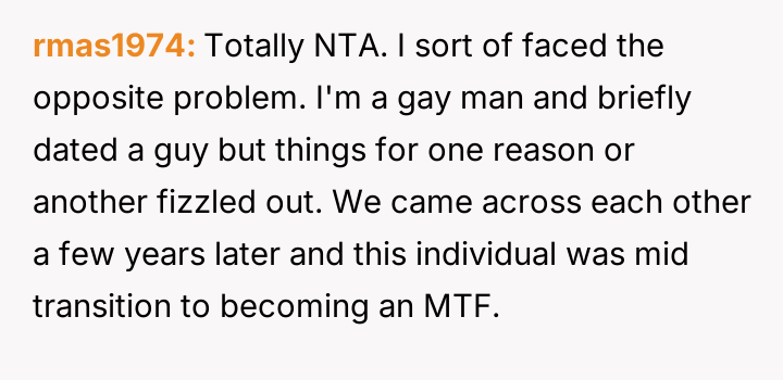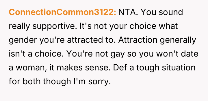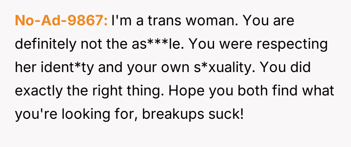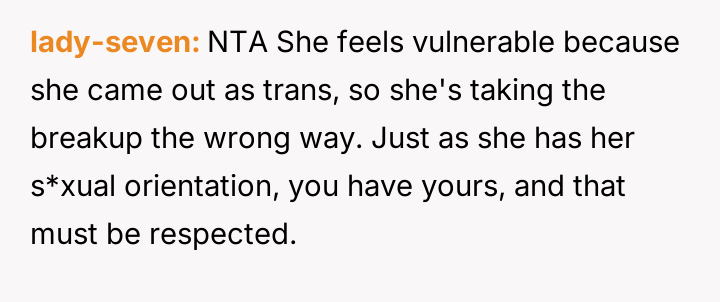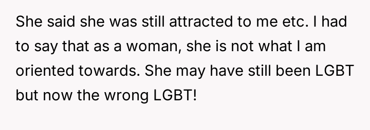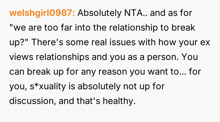 This conflict leaves the OP questioning whether her decision to end the relationship based on s*xual orientation makes her the bad person in the situation.