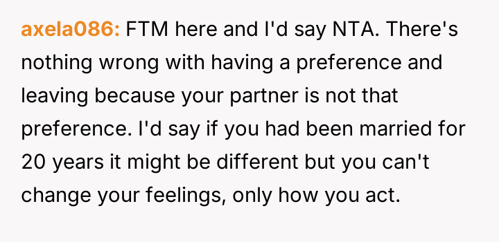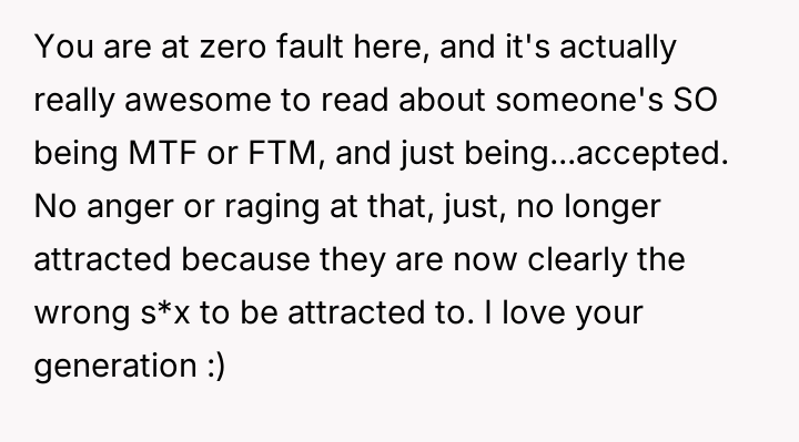 The OP identifies as 100% straight and stated that her decision to break up was directly due to her partner now being a woman, as s*xual orientation dictates her attraction.