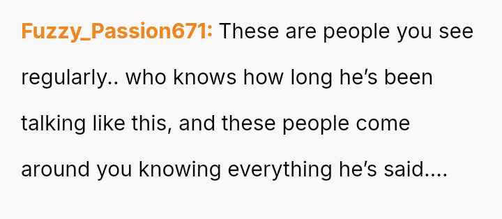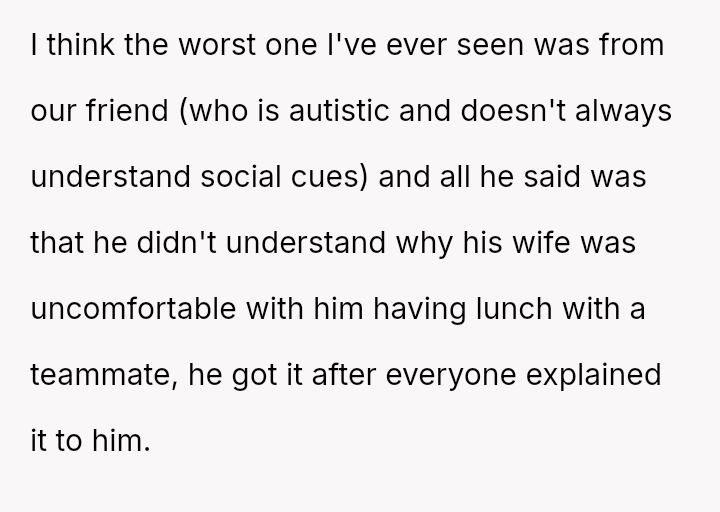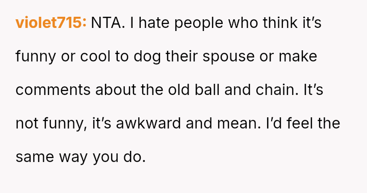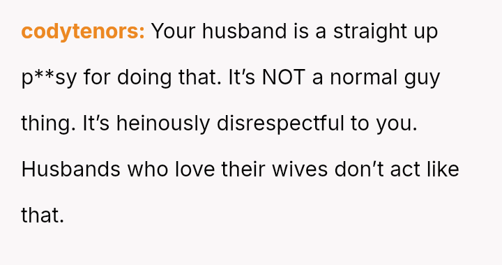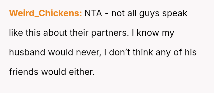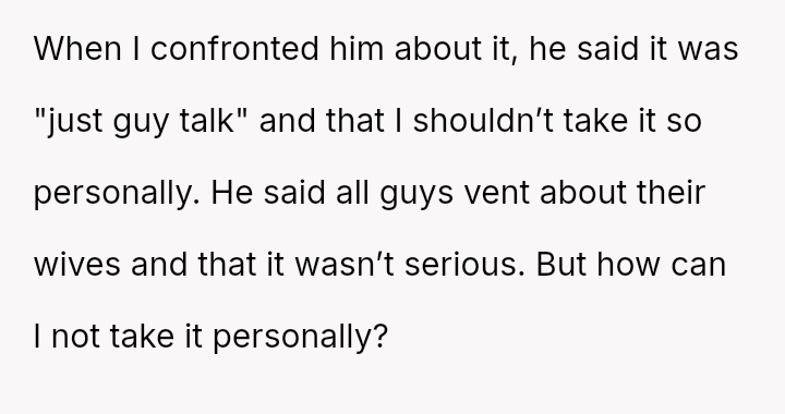 When confronted, the husband dismissed the comments as typical 'guy talk' and told her she was overreacting.
