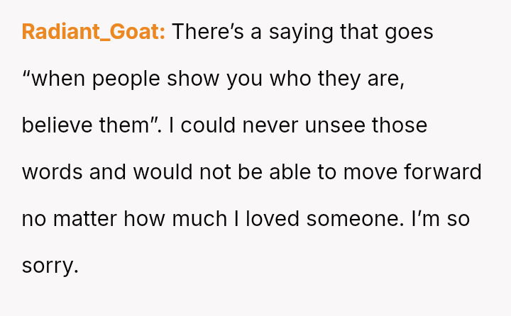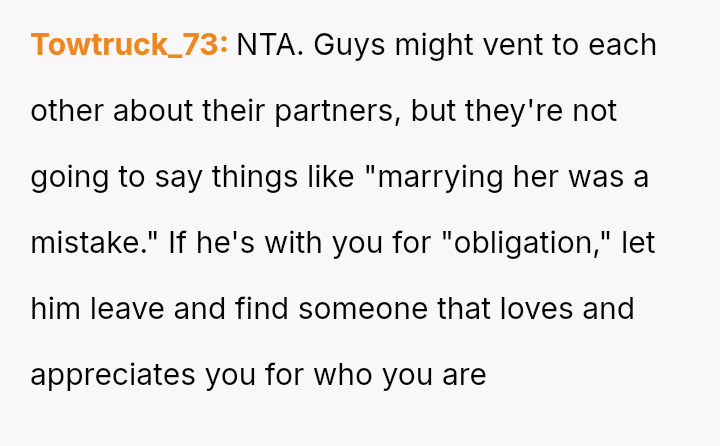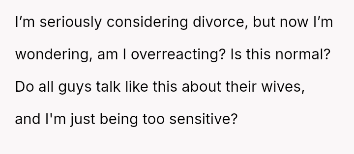The central debate is whether words spoken privately to friends, even extremely damaging ones that question the legitimacy of the relationship, const*tute grounds for ending a marriage, or if the OP should accept the husband's explanation that such venting is normal and requires her to 'let it go.' Is the OP overreacting, or is this disclosure a fundamental breach of trust?