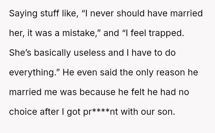 The messages revealed that the husband was speaking very negatively about the OP to his friends, calling her useless, claiming he felt trapped, and stating that marrying her was a mistake, only done because she became pr****nt with their son.