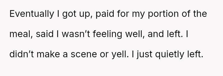 Feeling ignored and overshadowed, the OP quietly left after paying for his meal, leading to accusations from his girlfriend and her friends that he was ungrateful and immature.