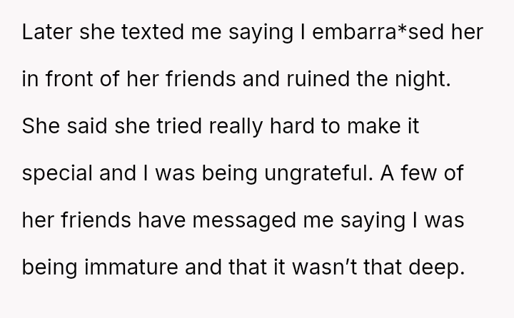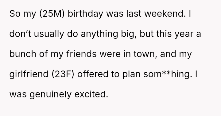 The user, a 25-year-old man (OP), celebrated his birthday last weekend. His 23-year-old girlfriend offered to plan a special event, which initially excited the OP, especially since several friends were visiting the area.