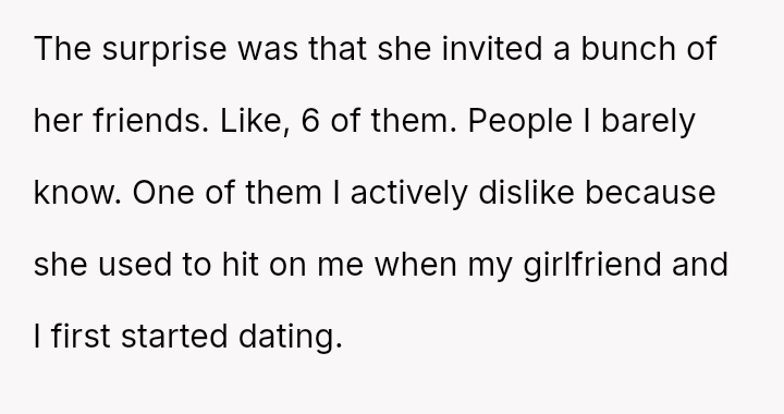 The surprise element of the plan turned out to be the inclusion of six of the girlfriend's friends, including someone the OP actively dislikes.