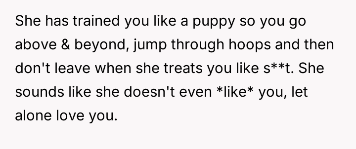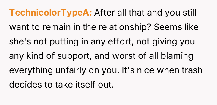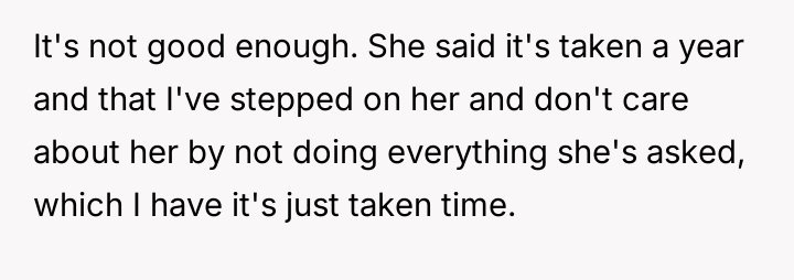 The question for debate is whether the OP should continue striving to meet an ever-moving target set by his partner, or if this pattern of blame and dismissal indicates an unsustainable relationship dynamic where effort is fundamentally undervalued.