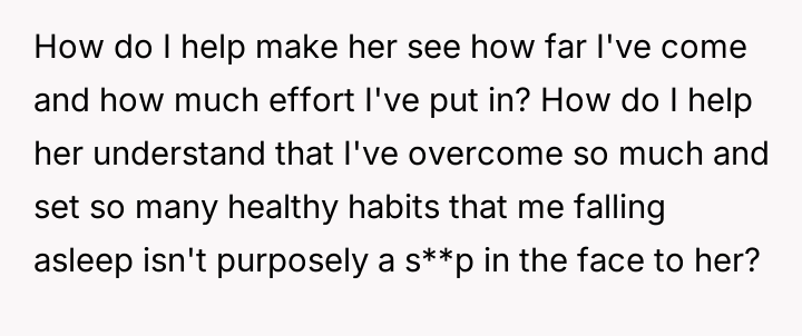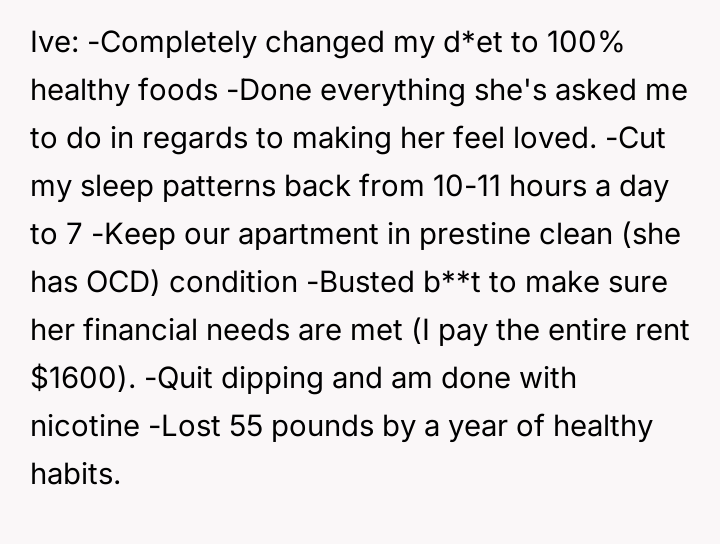 The OP is currently in a difficult emotional position, feeling exhausted and unappreciated because he believes he has made drastic, positive changes—including major health shifts, financial contributions, and maintaining household standards—only to have them dismissed over a single instance of needing rest.