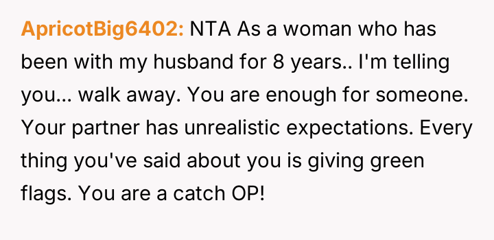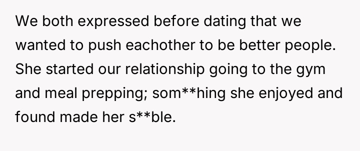 Both partners entered the relationship aiming to help each other improve, with the girlfriend es**blishing healthy habits like gym attendance and meal prepping, and the OP making significant personal changes, including losing 55 pounds through d*et and exercise.