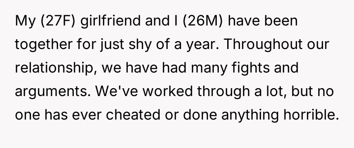 The user, a 27-year-old male (OP), describes his nearly one-year relationship with his 26-year-old girlfriend, noting that while they have had many arguments, neither party has been unfaithful.