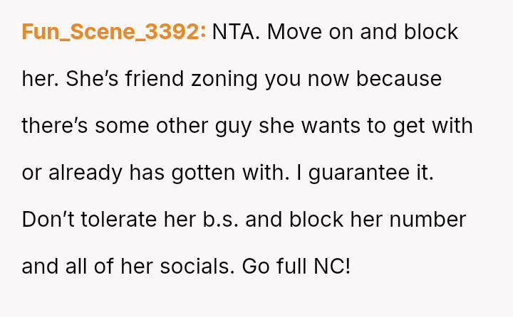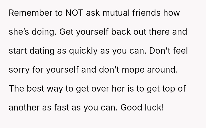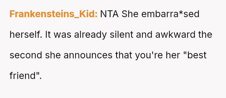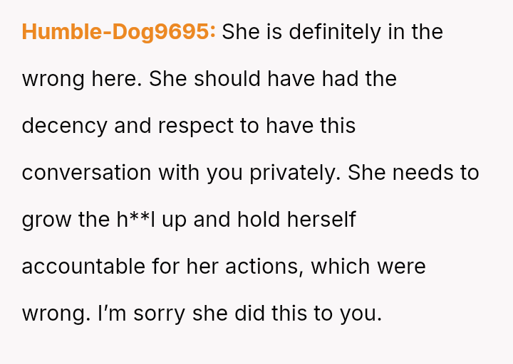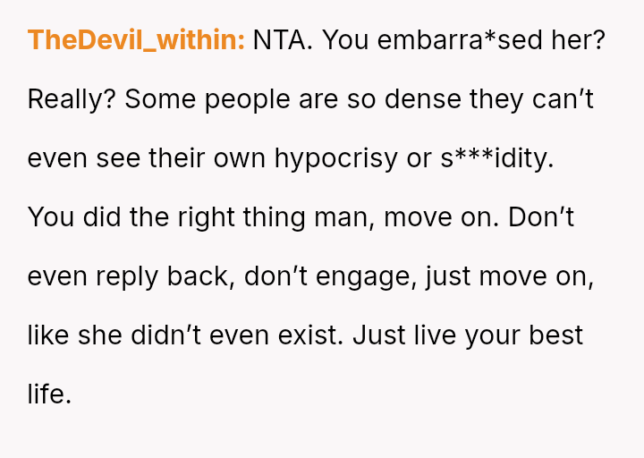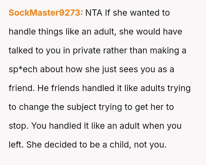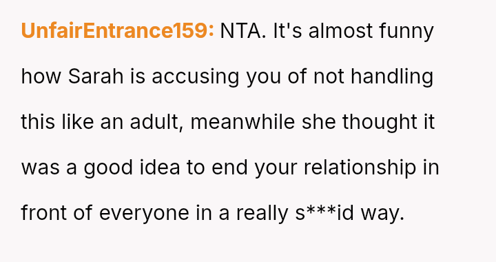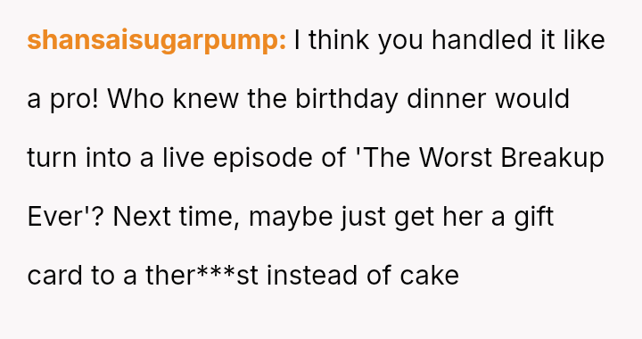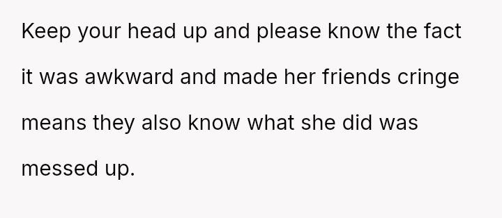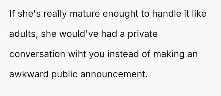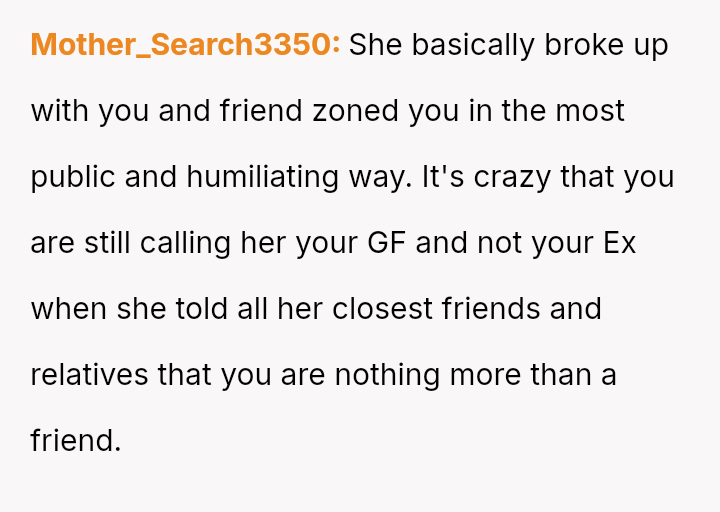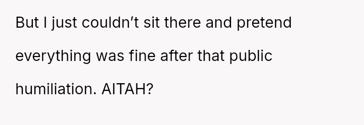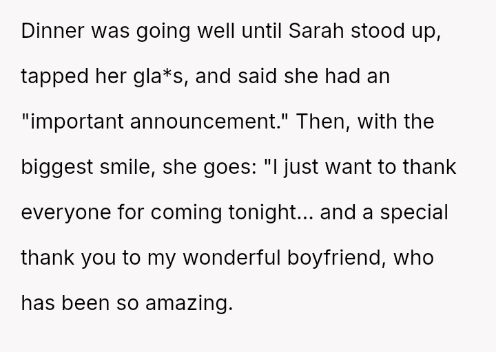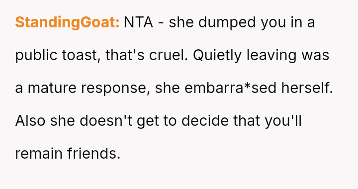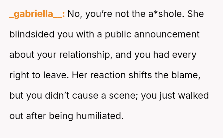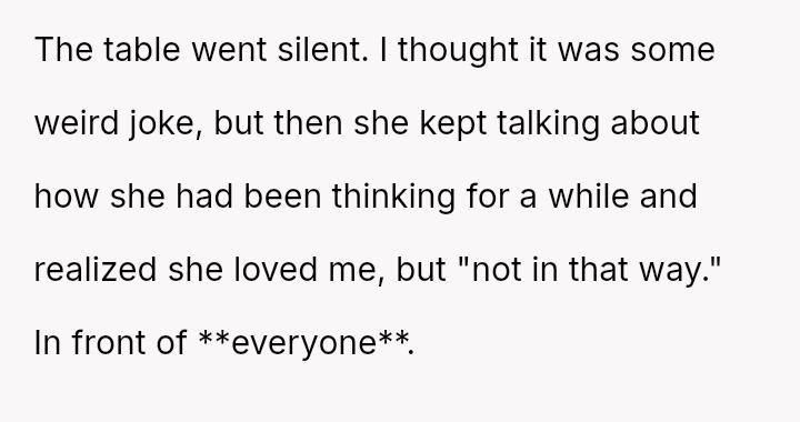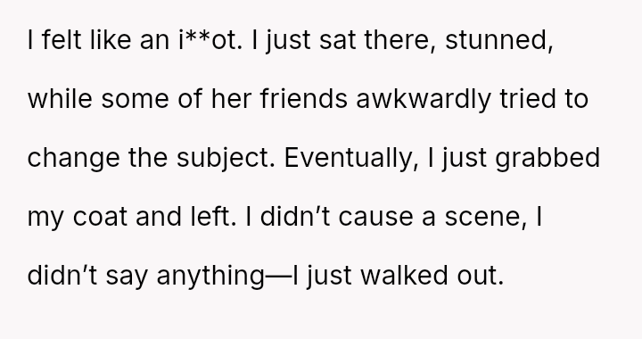 and nothing more." Following her public breakup announcement, the user felt stunned and humiliated, eventually leaving the dinner without confrontation.