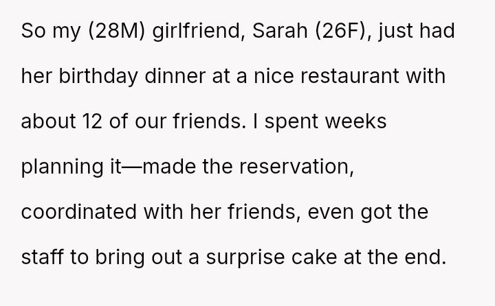 The user, a 28-year-old male, planned a birthday dinner for his 26-year-old girlfriend, Sarah, inviting about twelve mutual friends to a nice restaurant.