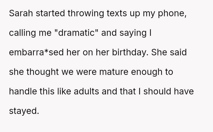 The core question centers on whether the manner of the breakup—publicly delivered by Sarah—justified the OP's immediate, non-verbal exit, or if his departure was an inappropriate reaction to his partner's needs on her own birthday?