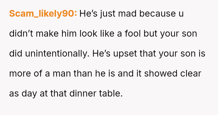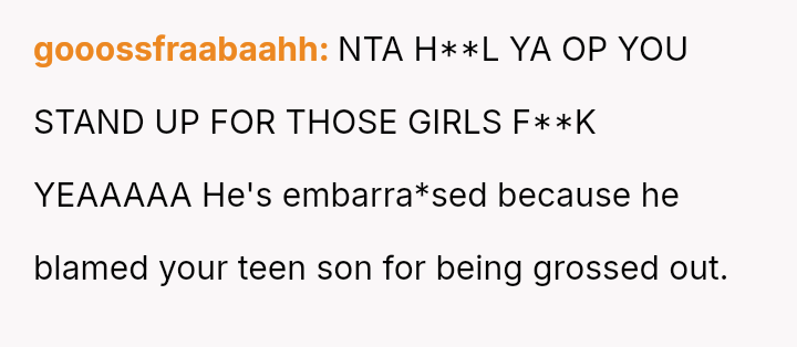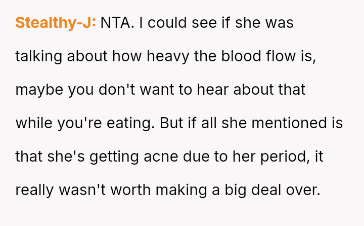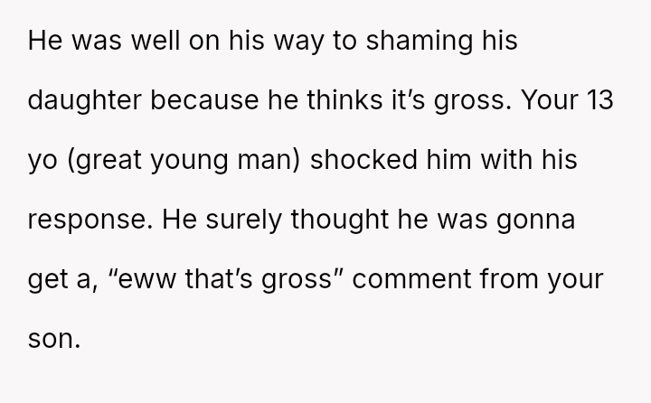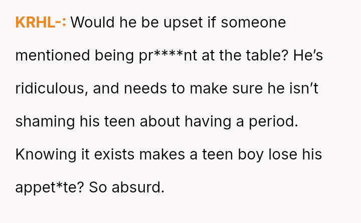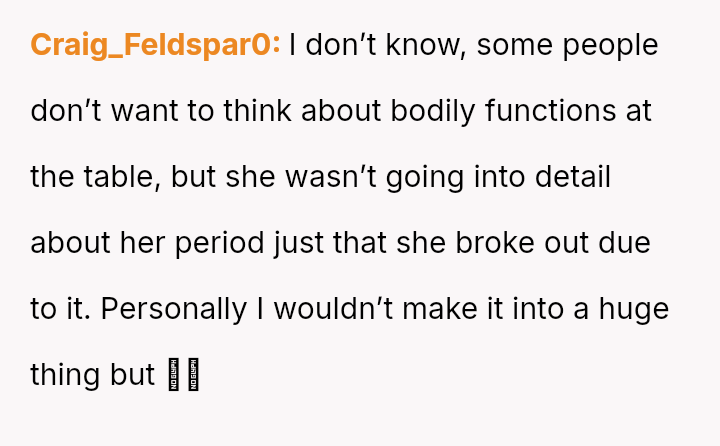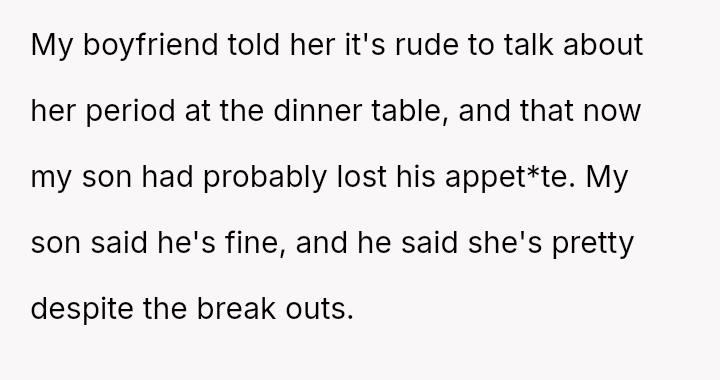 The boyfriend immediately criticized his daughter, stating it was rude to discuss periods at the dinner table and suggesting it might ruin the son's appet*te.