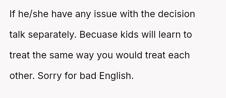 The central debate is whether prioritizing shared family norms regarding bodily functions outweighs the need to present a united front on discipline and public behavior to the children.
