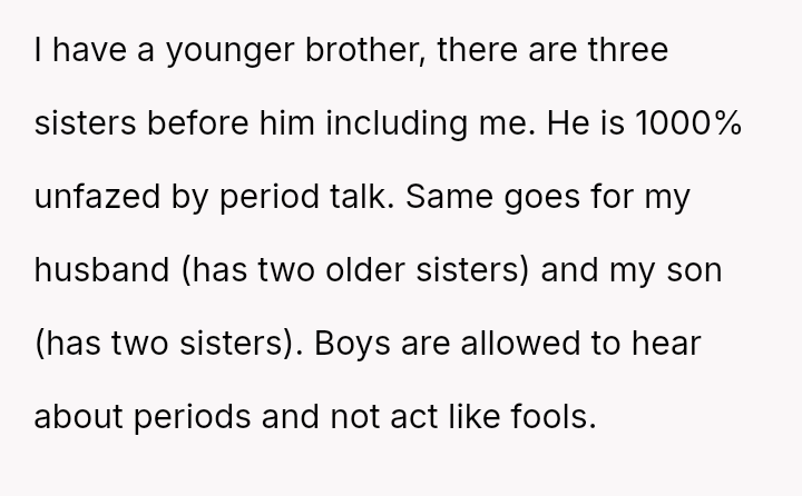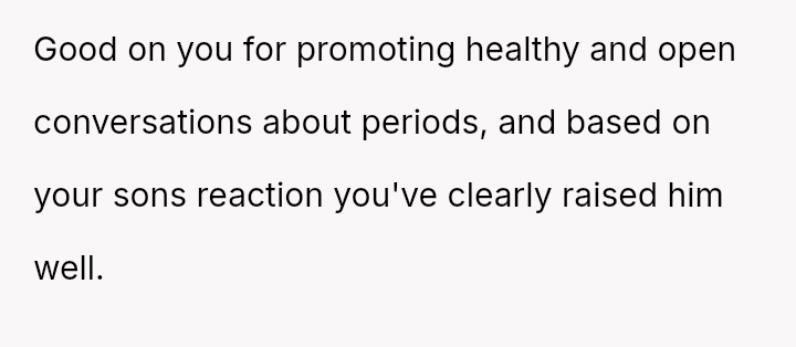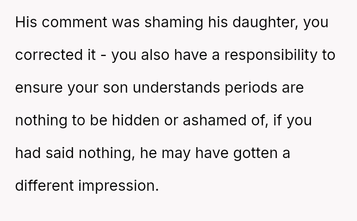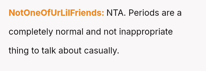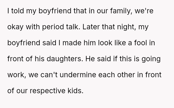 When the user stated that in their family, period-related discussions were acceptable, the boyfriend later confronted her, claiming she undermined him in front of his children. The user is now questioning if she was wrong in that situation.