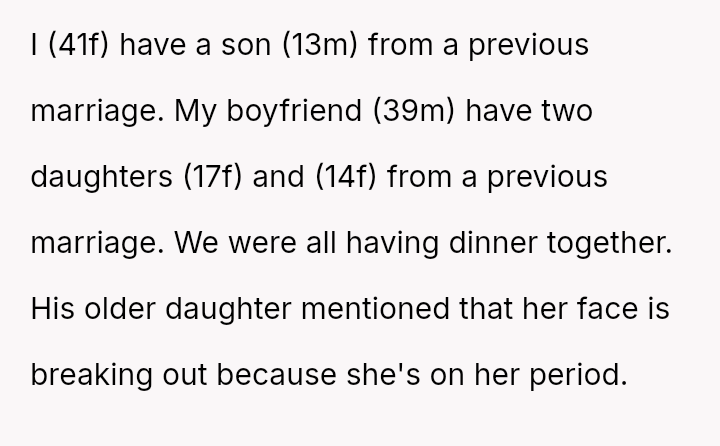 During the meal, the boyfriend's older daughter mentioned that her face was breaking out because she was on her period.