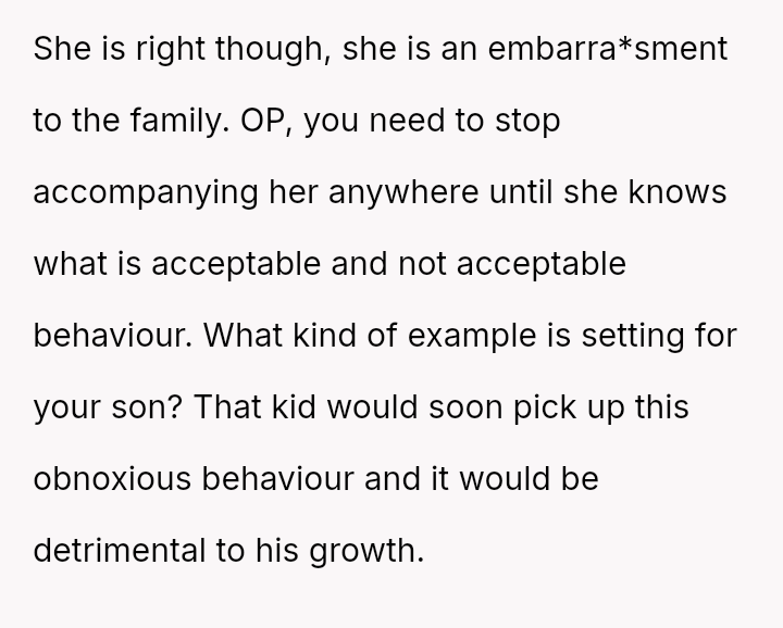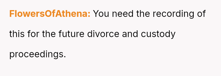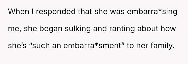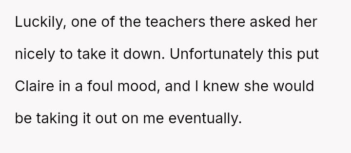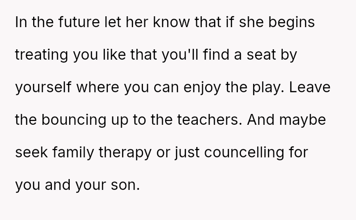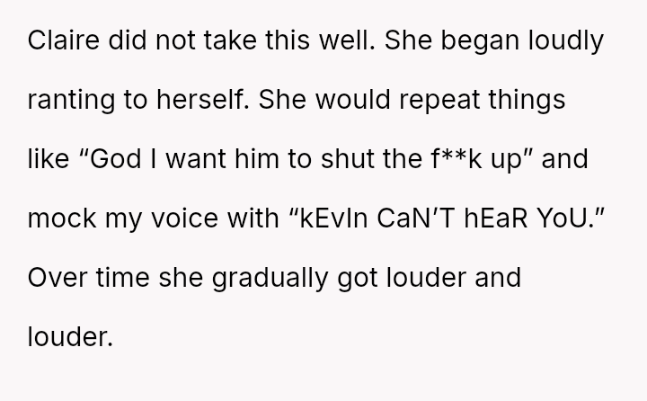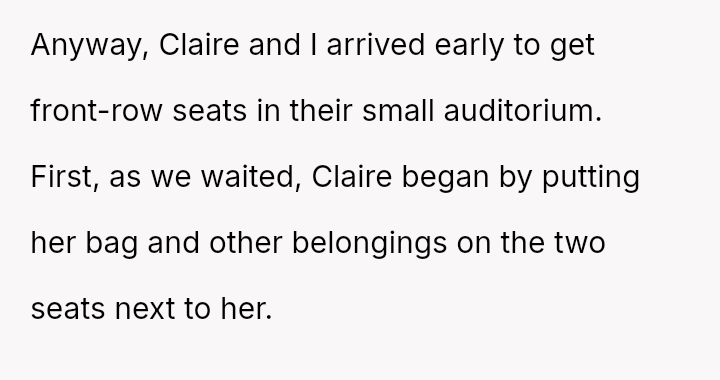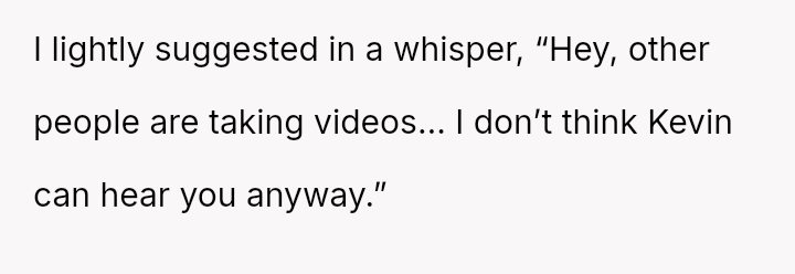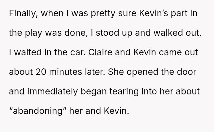 When the OP quietly suggested she stop because others were filming, Claire reacted by loudly mocking him and ranting. Feeling embarra*sed, the OP eventually left the auditorium and waited in the car.