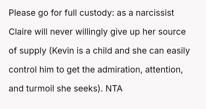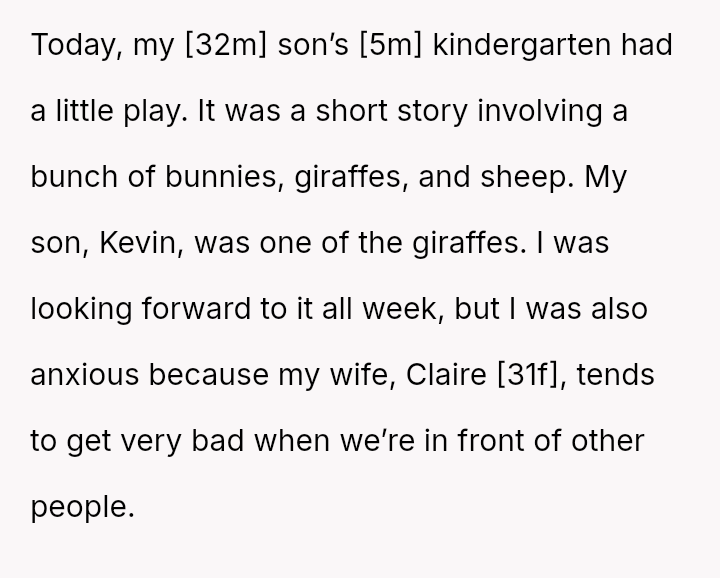 The OP, a 32-year-old man, attended his 5-year-old son Kevin's kindergarten play. The OP was looking forward to the event but was anxious because his wife, Claire (31f), often displays aggressive and rude behavior toward him in public settings.