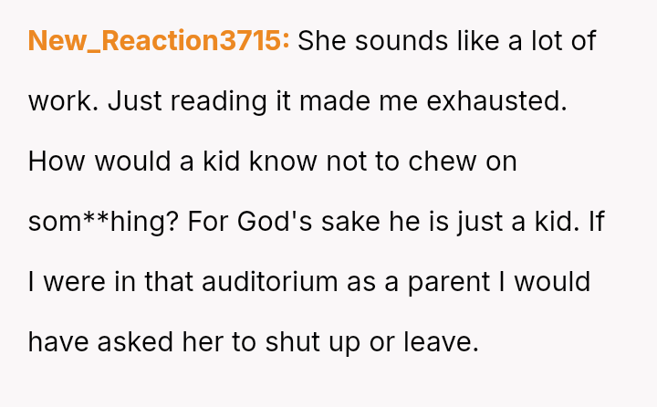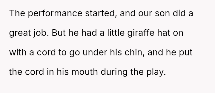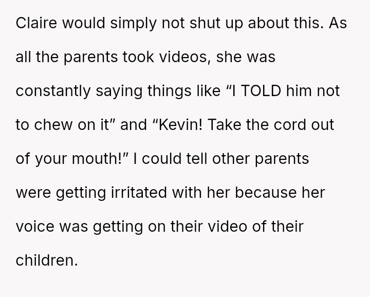 During the performance, Claire made loud, repeated comments criticizing their son for chewing on his giraffe hat cord, irritating surrounding parents who were trying to record.