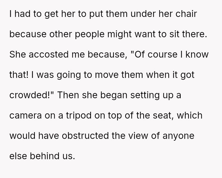 The initial conflict arose before the play began when Claire insisted on reserving multiple seats with her belongings and setting up a tripod camera in a way that would block others' views.