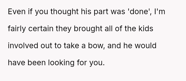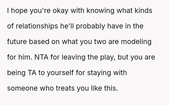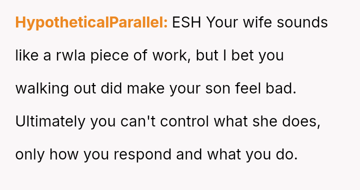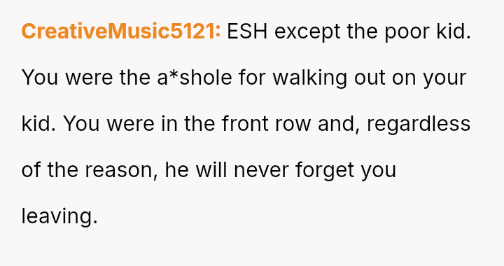 The central question for debate is whether the OP was justified in leaving his wife and son alone in the auditorium as a direct response to her embarra*sing public outburst, or if his departure escalated the situation by failing to support her, regardless of her poor behavior. Should he have endured the situation or confronted her more firmly beforehand?