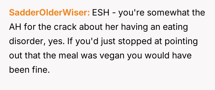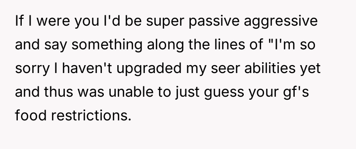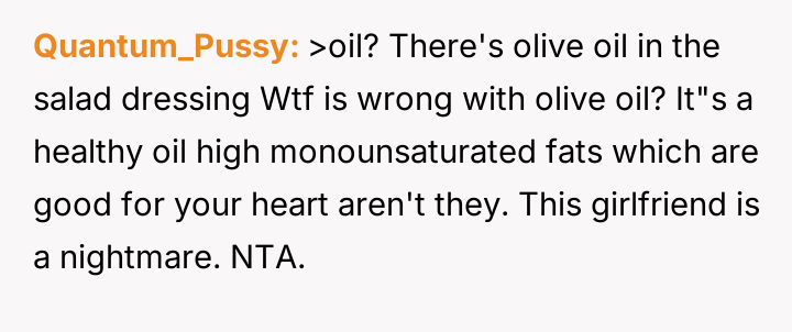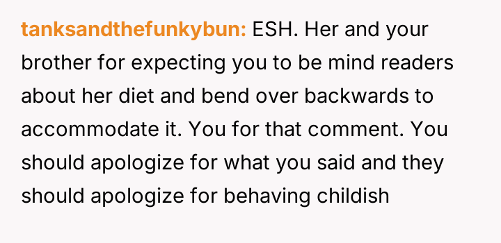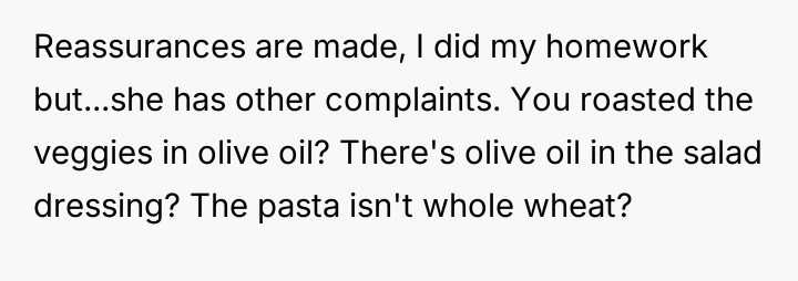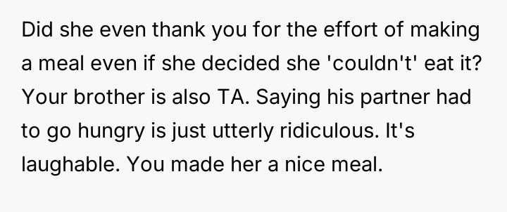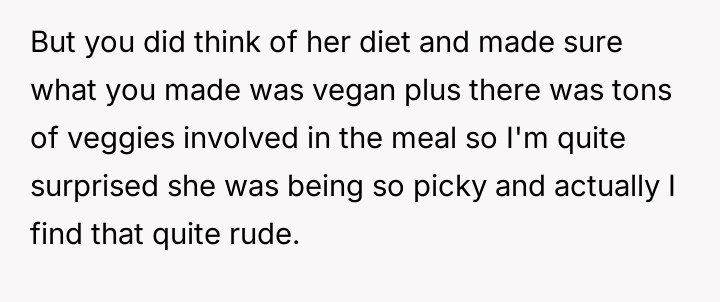 Considering the OP's sincere effort to meet the dietary requirement versus the fiancée's apparent dissatisfaction with the execution, is the OP justified in feeling that their effort was unappreciated, or did the fiancée have a reasonable expectation that the accommodation should meet a certain personal standard of quality and health?