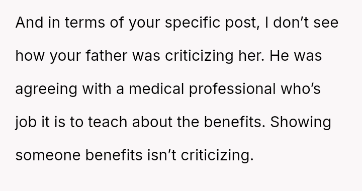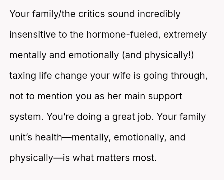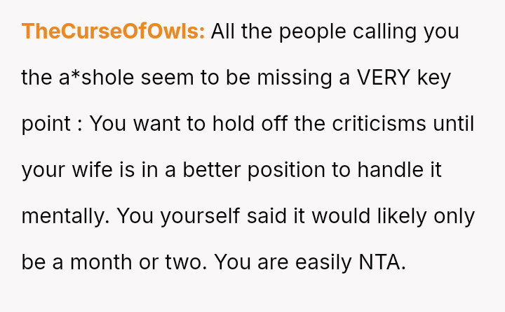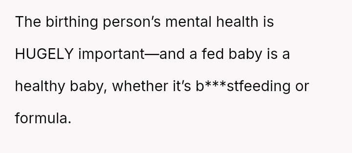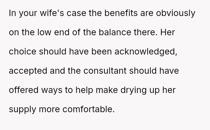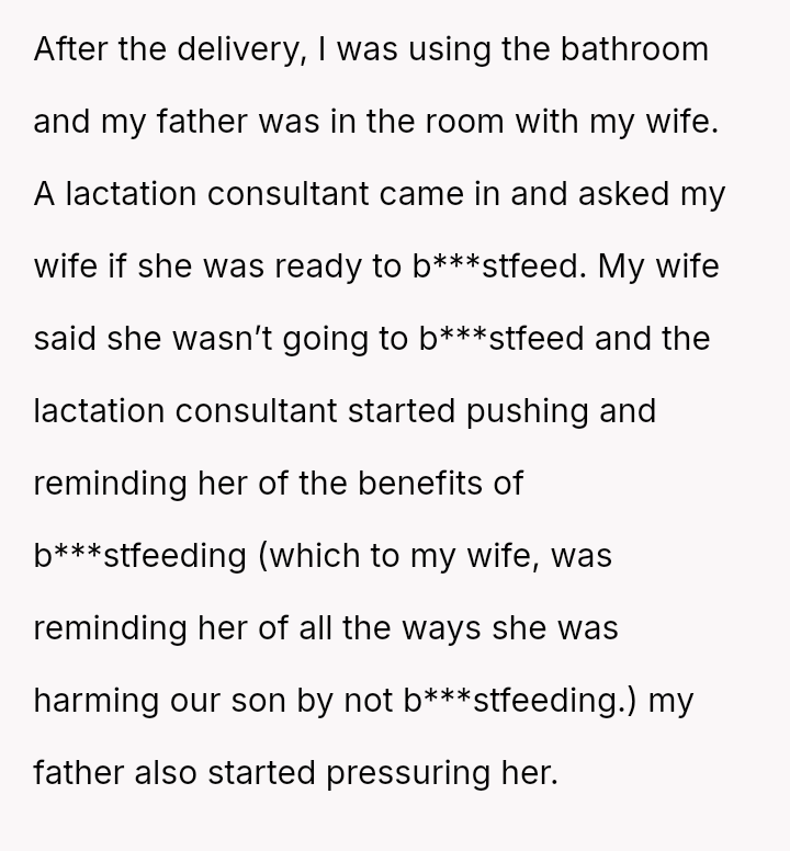 The original poster (OP) prioritized his wife's immediate mental health and autonomy following a difficult pregnancy, explicitly defending her right to refuse b***stfeeding against external pressure from both medical staff and family.