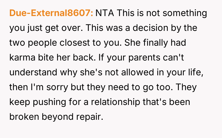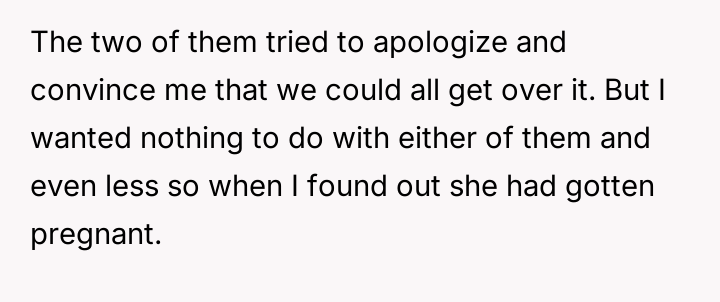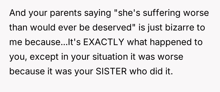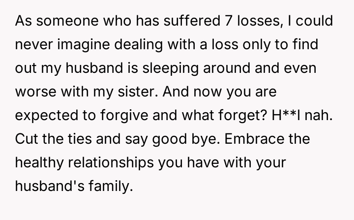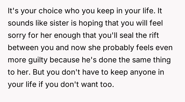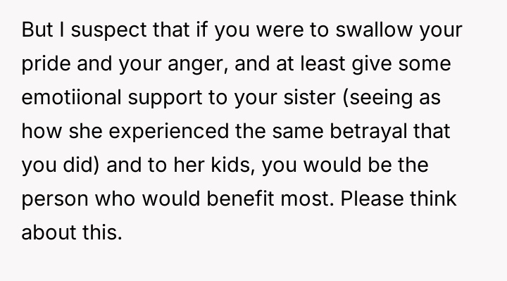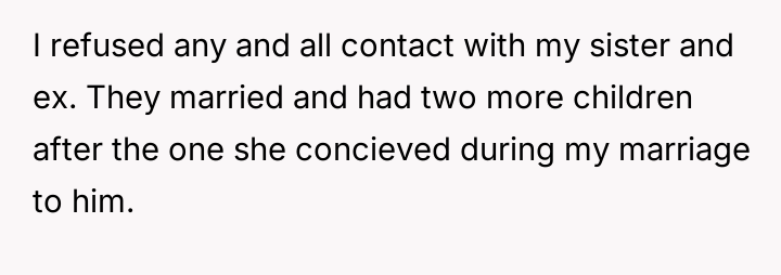 The original poster (OP) experienced a profound betrayal seven years ago involving her husband and sister, which led to the immediate end of her marriage and a complete severing of ties with her family of origin.