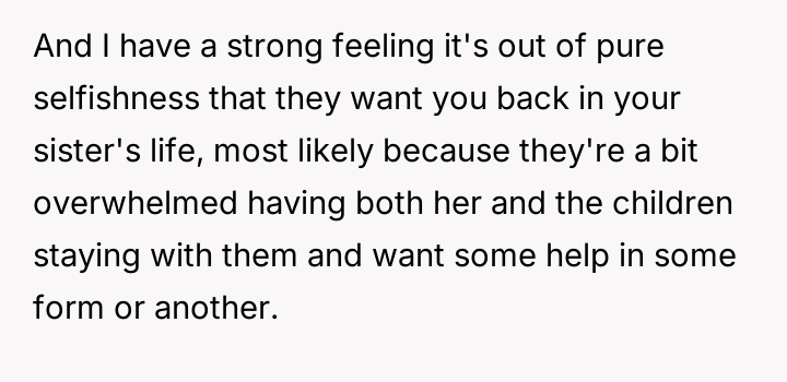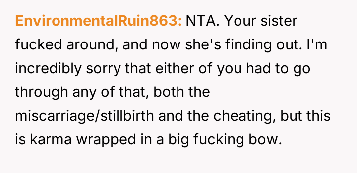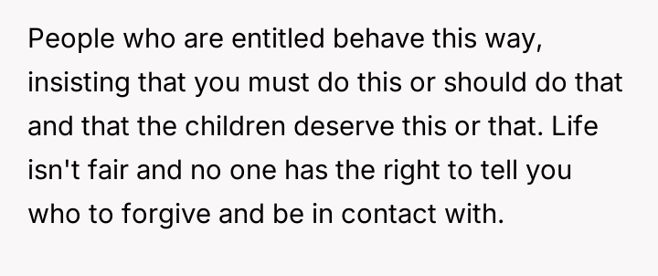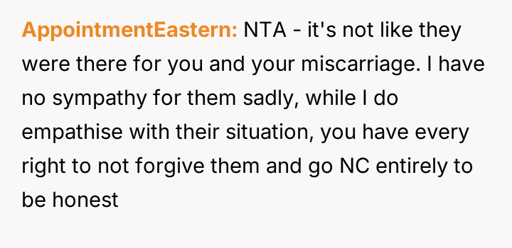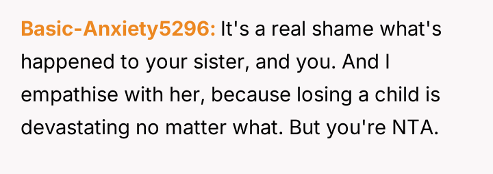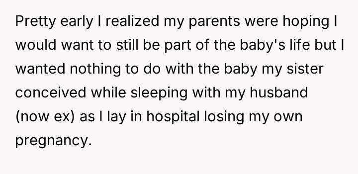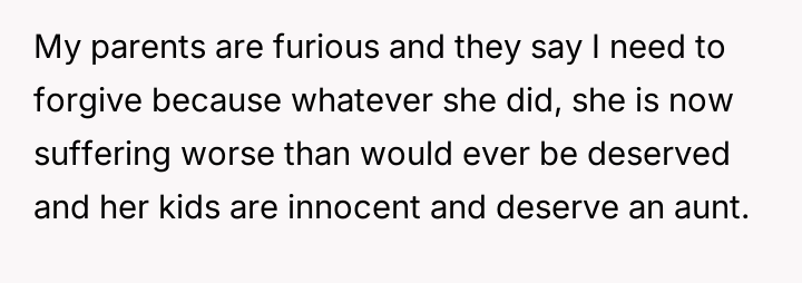 Currently, the central conflict revolves around the OP's refusal to offer support or reconciliation to her sister following a recent stillbirth, an expectation strongly enforced by her parents who argue that suffering warrants forgiveness and that innocent nieces and nephews deserve an aunt.