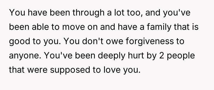 Given the extreme nature of the original offense and the OP's establishment of a new, positive family unit, the debate centers on whether the OP is obligated to prioritize her family's current emotional needs and perceived moral duty to forgive over her own long-term emotional safety and boundaries.