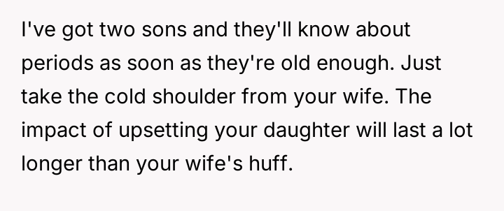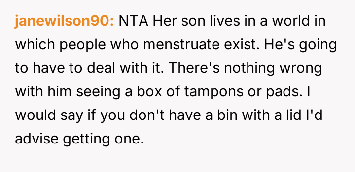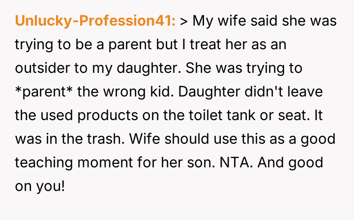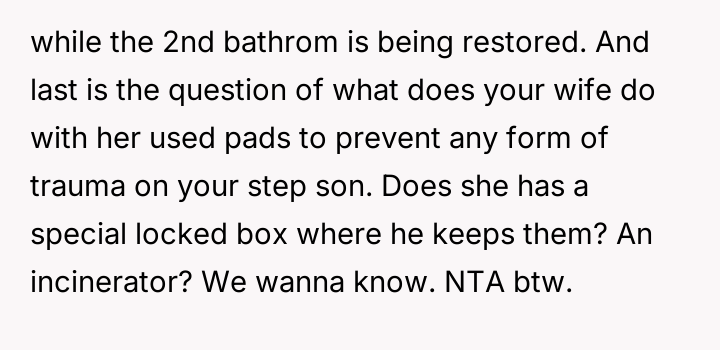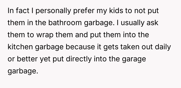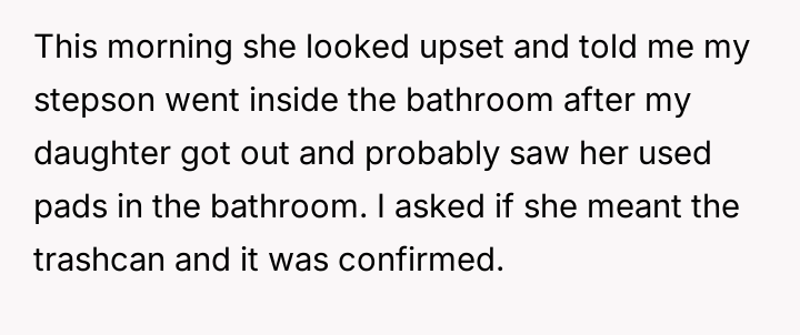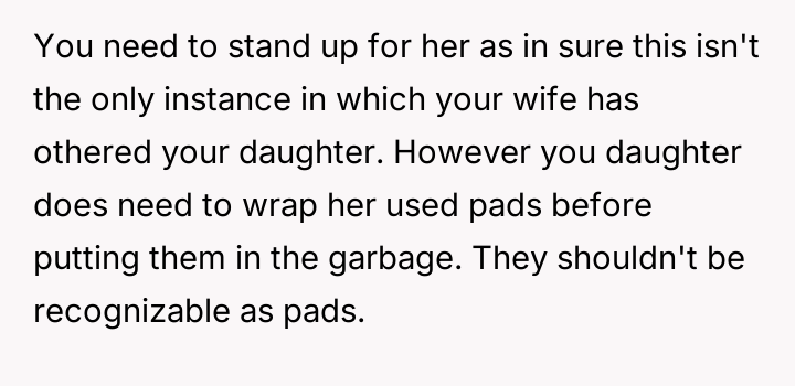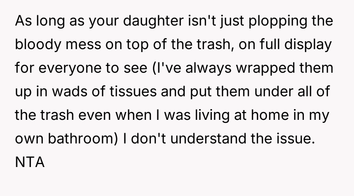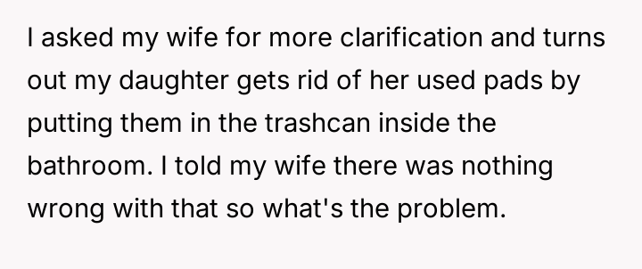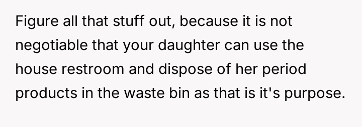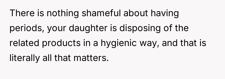 Given the differing views on privacy, modesty, and parental authority in addressing this sensitive topic, the core question remains: Should the OP prioritize his daughter's established routine and bathroom access, or should he accede to his wife's request to restrict her usage based on perceived modesty concerns for the stepson, even when the disposal method involves a lidded trash can?