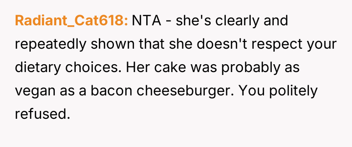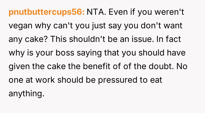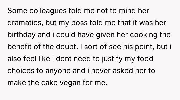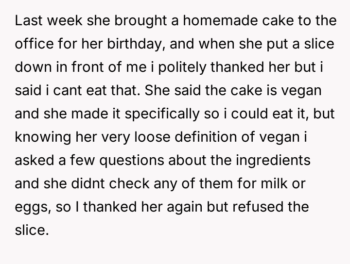 AITA for refusing to eat from my colleague's vegan birthday cake?