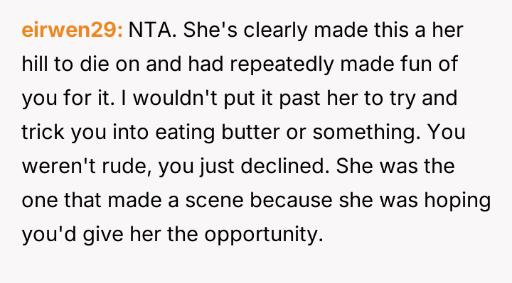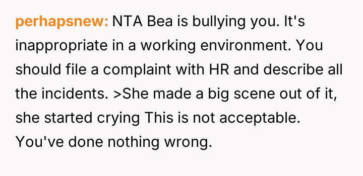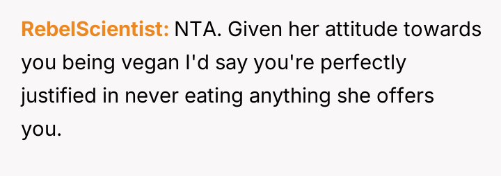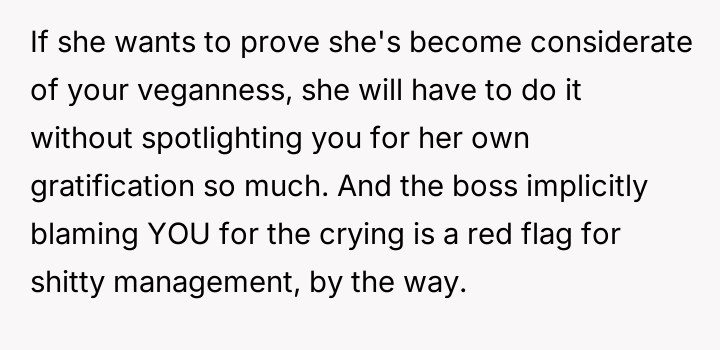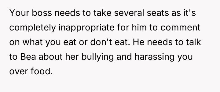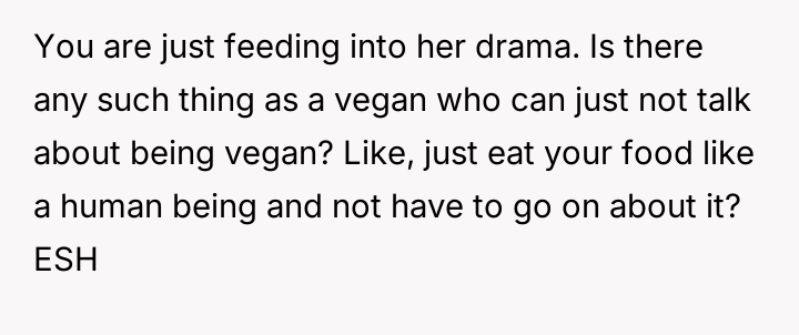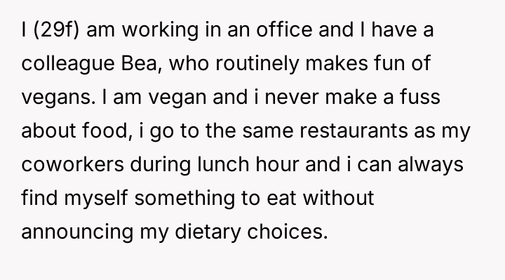 The original poster (OP) is facing a conflict where their firmly held ethical dietary choice (veganism) is being consistently challenged and mocked by a colleague, Bea.