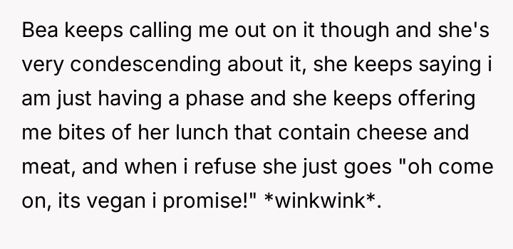 Bea’s persistent jabs and condescending offers of non-vegan food are not just childish pranks—they are a daily erosion of dignity and respect.