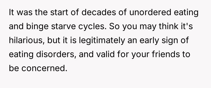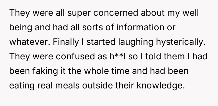 The original poster (OP) feels their commitment to a long-running prank about restrictive eating was solid and that their friends and girlfriend should have appreciated the effort.