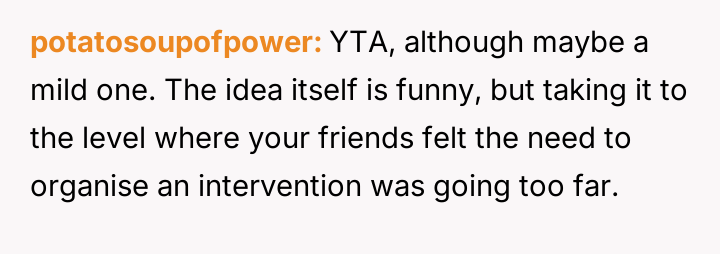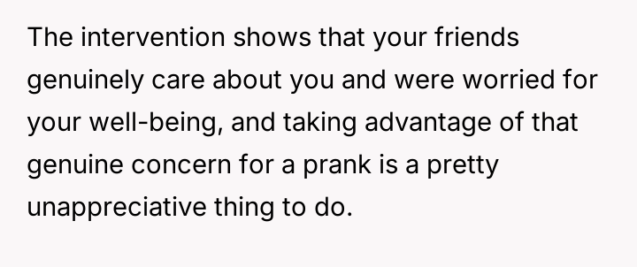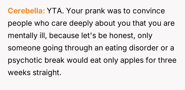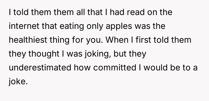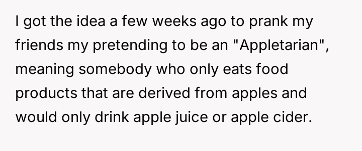 AITA for pretending to be an "Appletarian" (eating only apple derived foods/drinks) for 3 weeks as a prank, causing my friends to have an intervention for me?