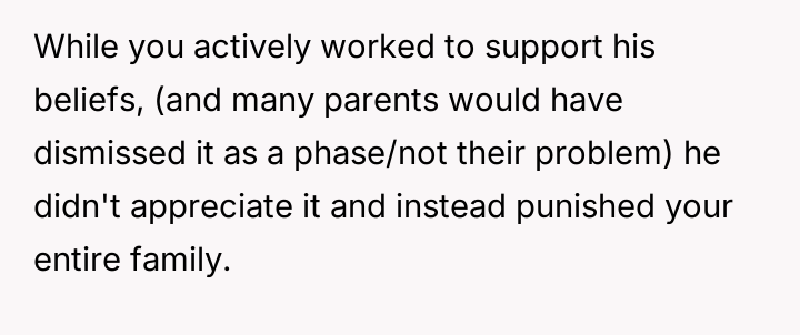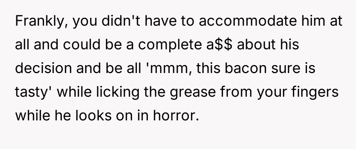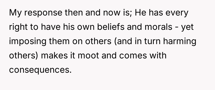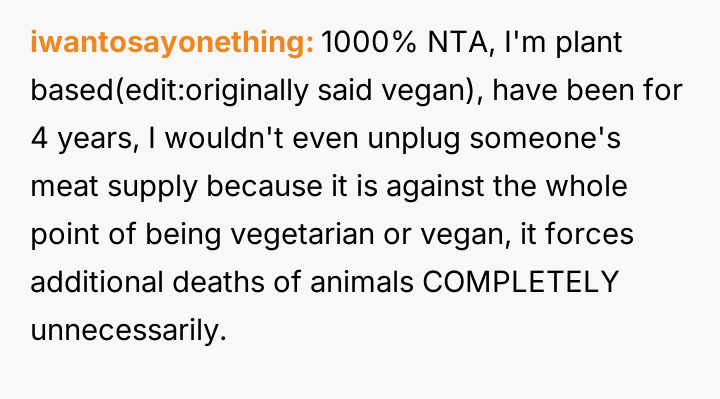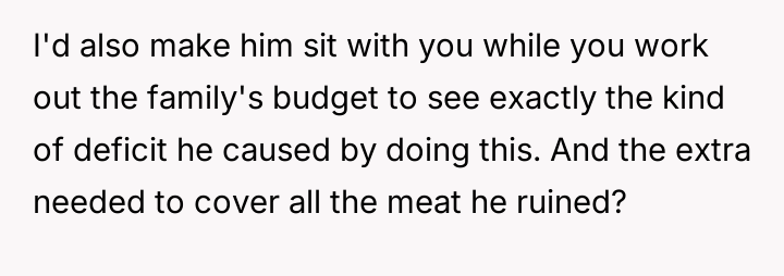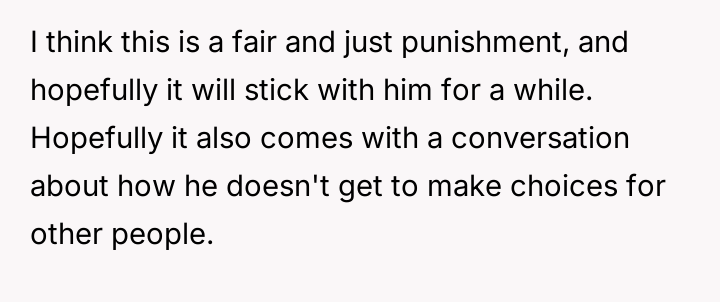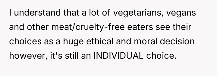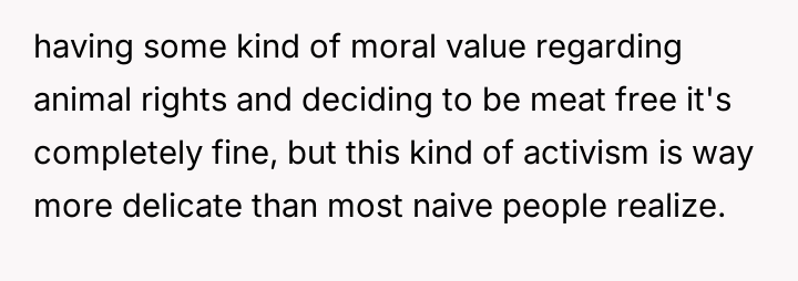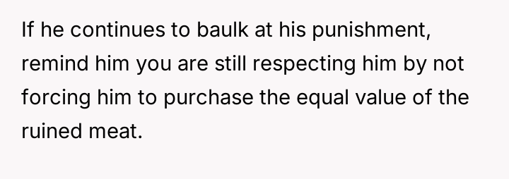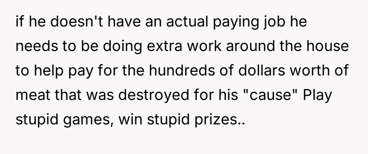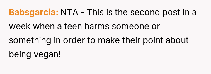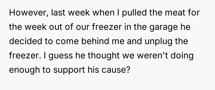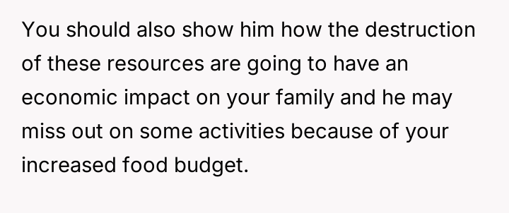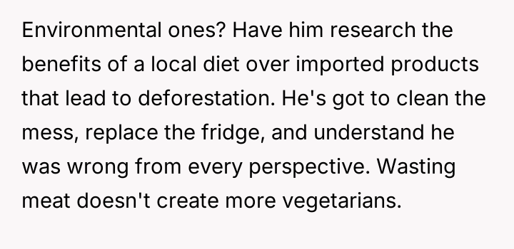 Was the son justified in taking extreme, damaging action to enforce his dietary beliefs without prior discussion, or was the father correct in imposing significant remedial and financial consequences for the destruction of valuable resources? Where does a child's moral stance end and their responsibility to the family unit begin?