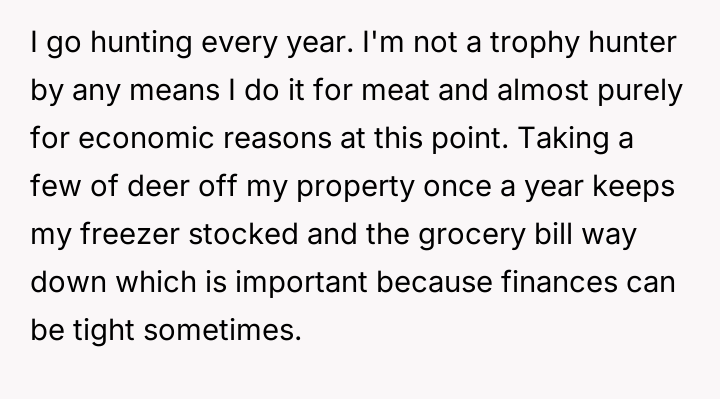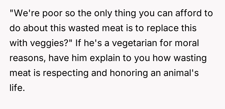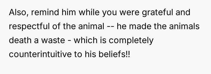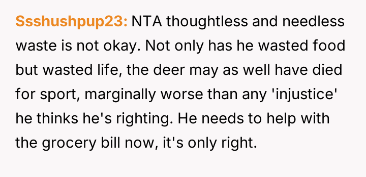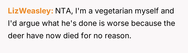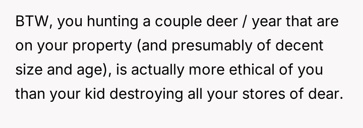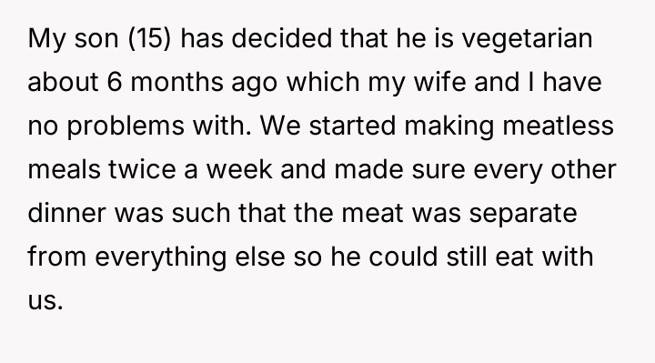 The core disagreement centers on the OP's reliance on hunting for sustenance versus the son's strong ethical opposition to consuming meat, leading to a punitive response from the father.