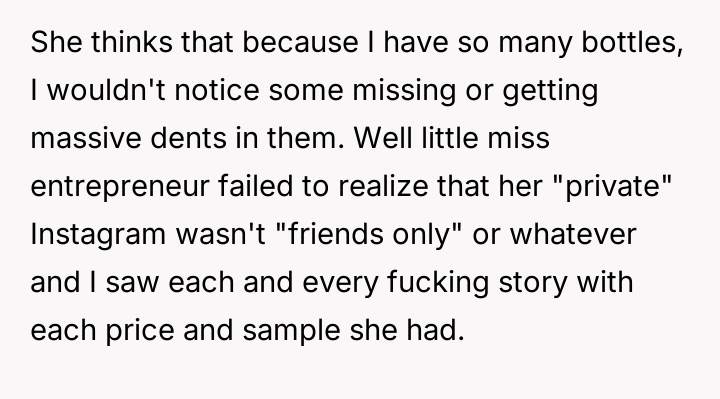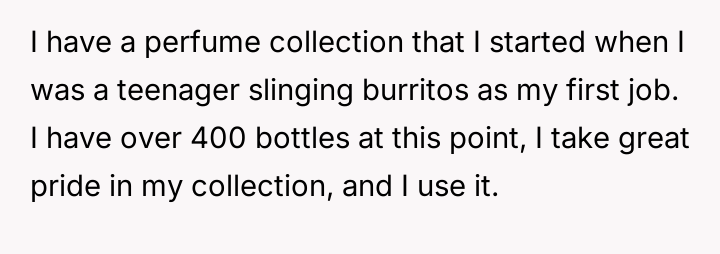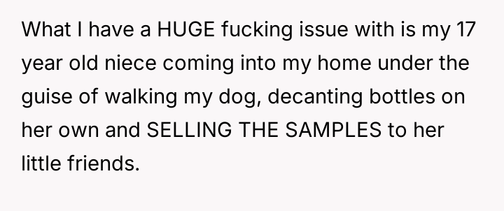 The original poster (OP) feels a strong sense of violation and theft regarding their valuable, personally meaningful perfume collection being exploited by their niece for unauthorized profit.