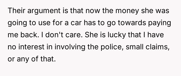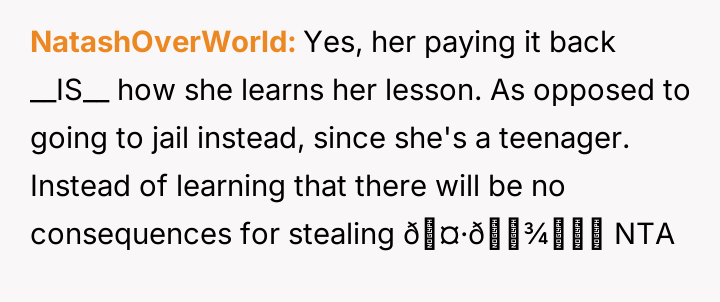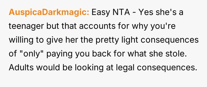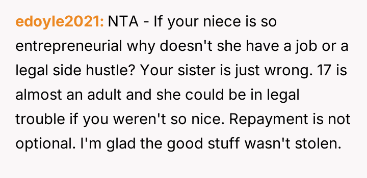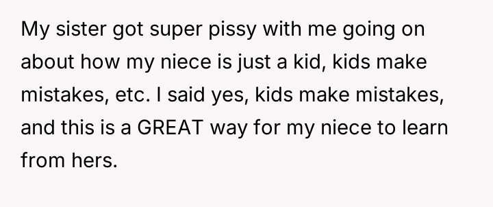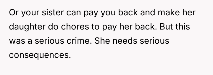 The central conflict is the OP's insistence on full financial restitution and banning the niece from their home, versus the sister's view that the niece, being a teenager, deserves leniency and should not face such severe financial consequences.