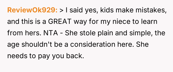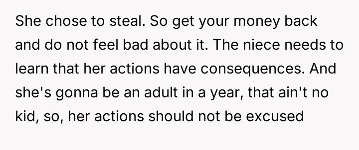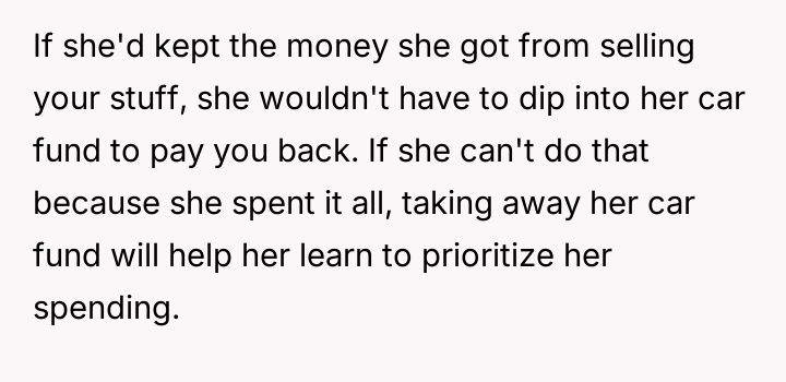 Given that the niece engaged in systematic, unauthorized taking and selling of expensive personal property, should the OP prioritize teaching a firm lesson about property rights and accountability, even if it impacts the niece's savings goals, or should the family dynamic and the niece's age warrant a less punitive approach to restitution?