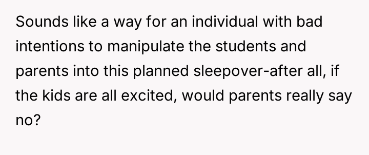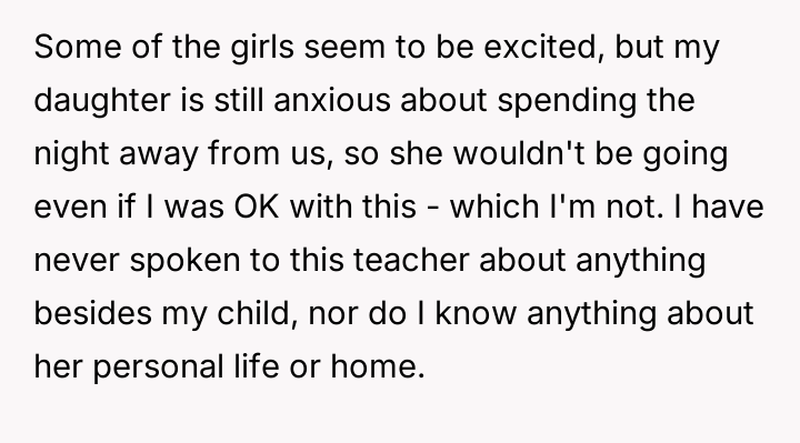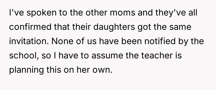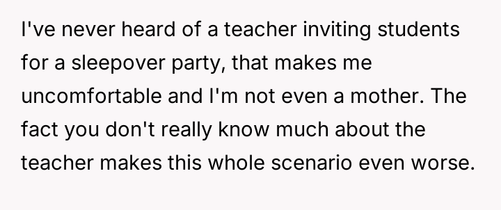 Given the differing reactions among the parents—some accepting while the OP remains highly cautious—the central question remains: Should parents prioritize trusting a teacher's informal invitation for a personal event, or is it always necessary to challenge such boundary-crossing behavior that occurs outside the established educational framework?
