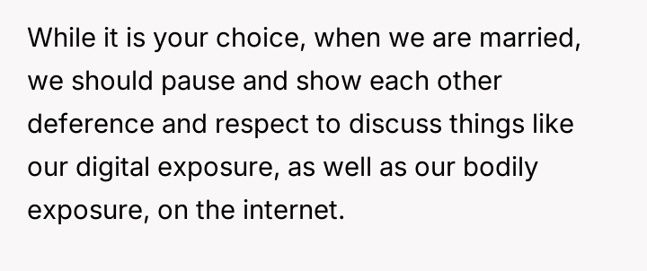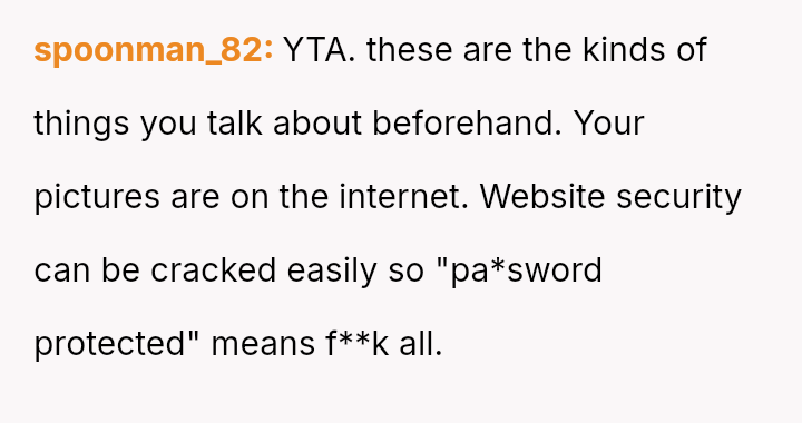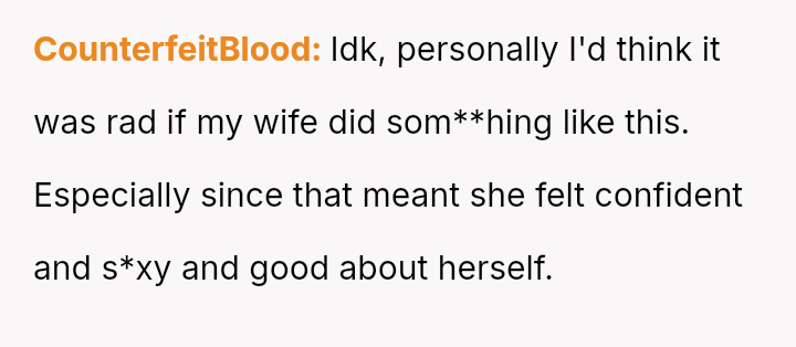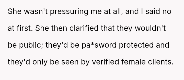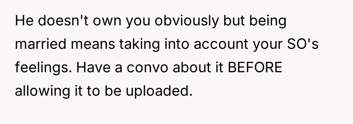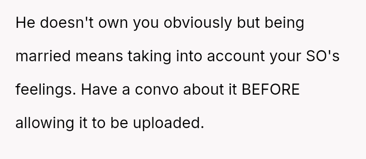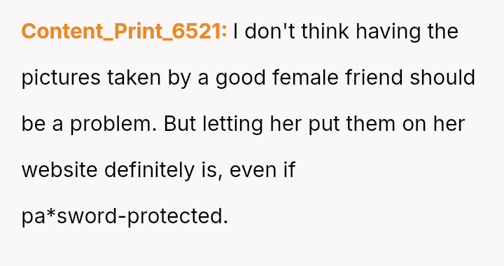 The central conflict arises because the OP's autonomous decision regarding her own body and the resulting images directly clashed with her husband's deeply held expectations regarding marital boundaries and control over shared intimate representation.