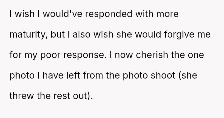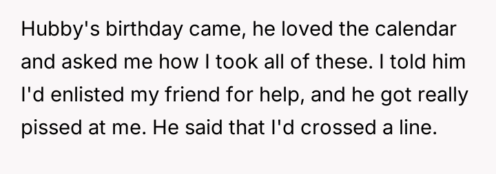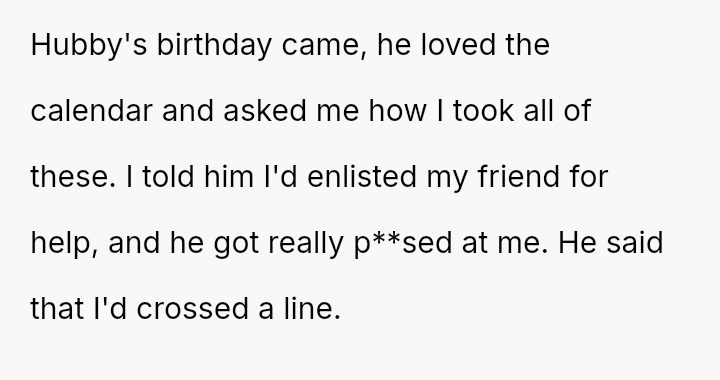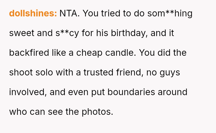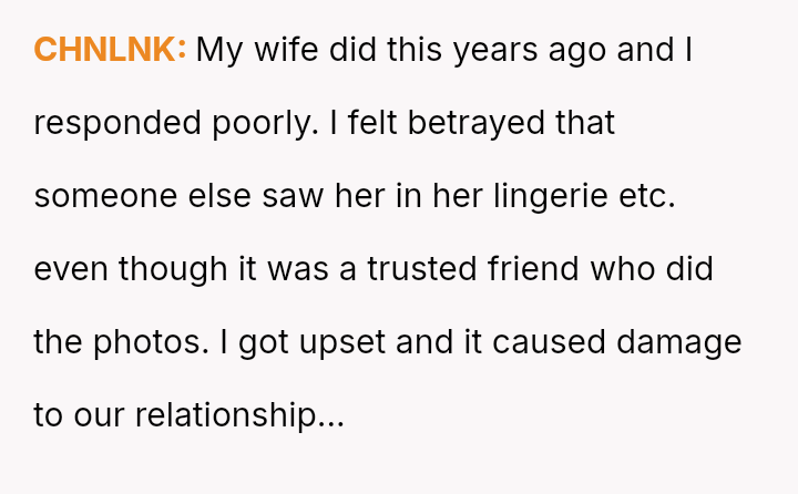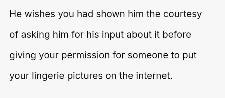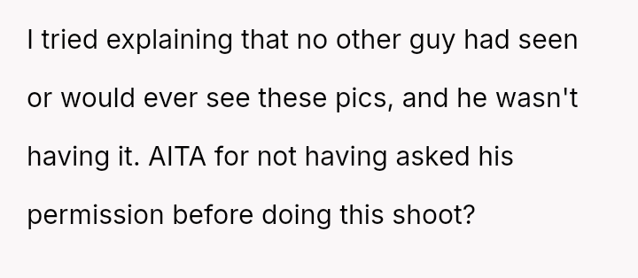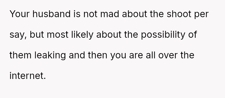 Was the OP wrong for proceeding with a private photoshoot, intended as a gift, without first securing her husband's explicit permission, or was the husband's reaction an overreach into the OP's right to personal expression and autonomy within the marriage?