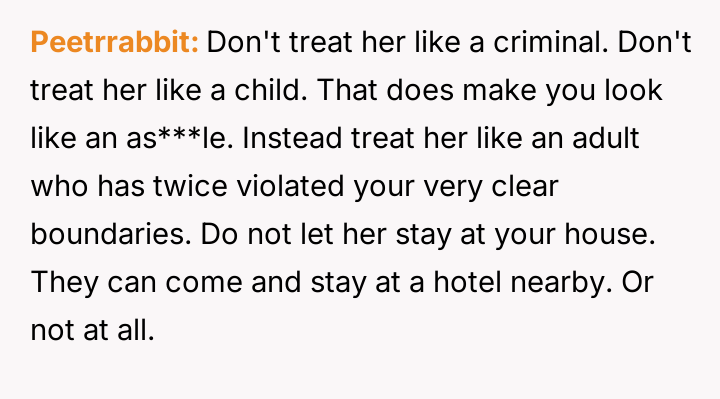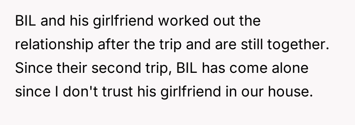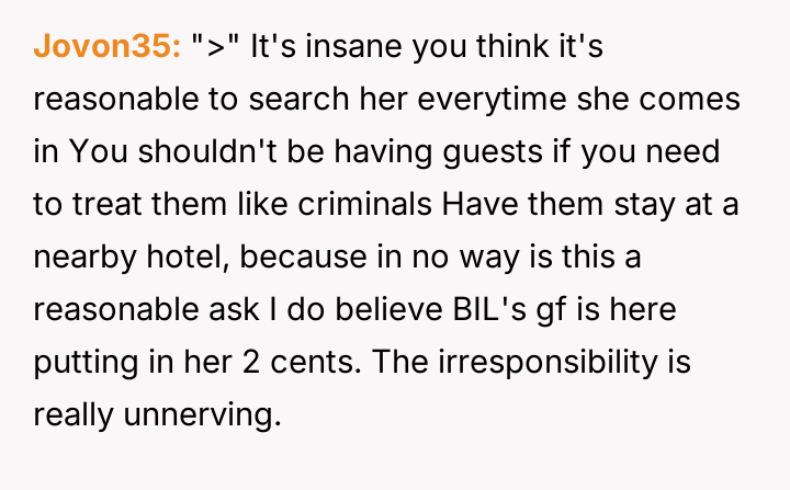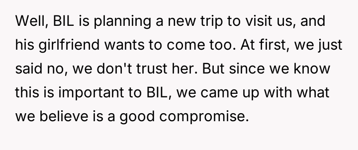 Now that the girlfriend wants to accompany the BIL on a new visit, the OP has proposed a compromise: she can stay, but her bags will be searched upon arrival, leading to accusations that the OP is treating her like a criminal and invading her privacy.