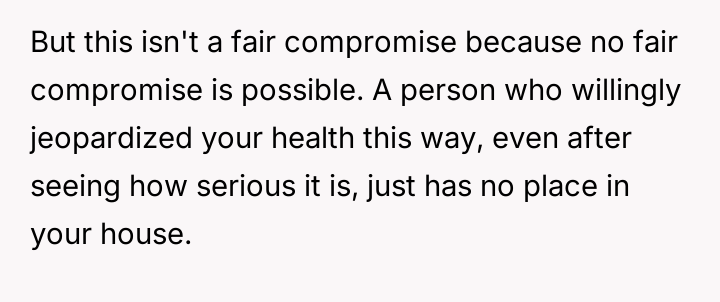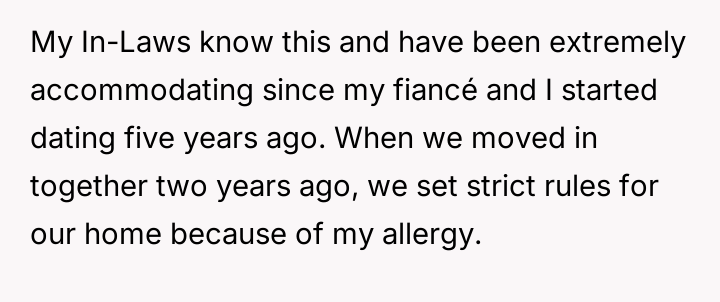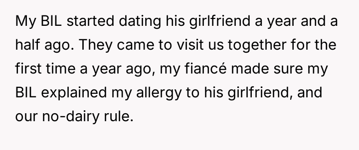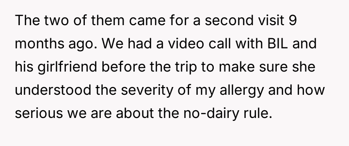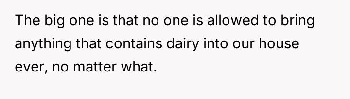 Because of this serious medical condition, the OP and their fiancé established a strict rule for their shared home: no dairy products are allowed inside, ever.