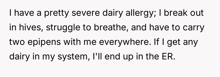 The original poster (OP) has a severe dairy allergy that requires carrying two epinephrine auto-injectors (epipens) because exposure leads to hives, breathing difficulty, and emergency room visits.