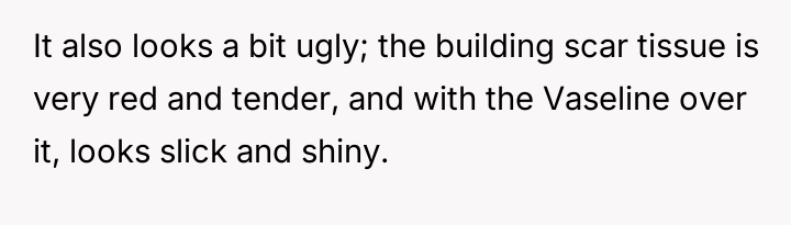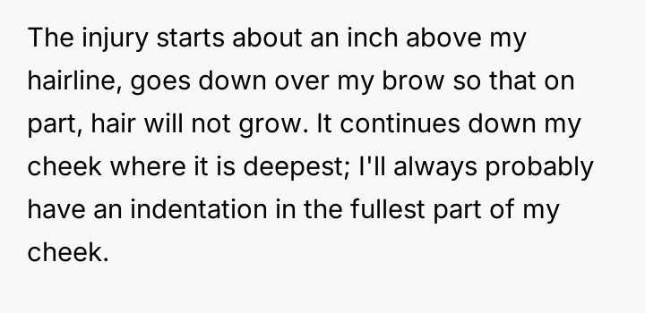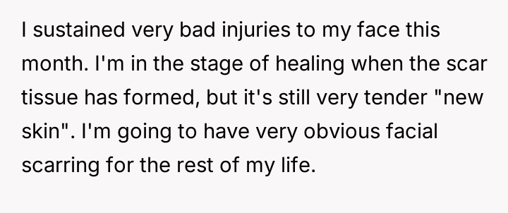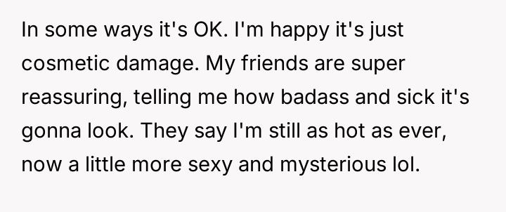 The original poster (OP) is navigating the complex emotional landscape of visible, permanent facial scarring following a severe injury.